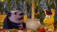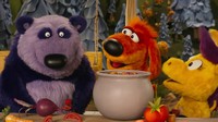 Grampy sets a timer while Donkey and Panda do their best to help Bob Dog wait. Coloring does not work because each color reminds Bob Dog of chili in some way. When Bob Dog mentions that he likes to sing songs, Donkey and Panda help the time pass by singing The Slow-Cook Chili Super Silly Waiting Jamboree. Bob Dog sings a song of his own -- The So Hard Waiting to Chew the Chili Blues. Finally, enough time has passed and after waiting for it to cool, everyone is able to enjoy Grampy Hodie's delicious chili. Songs