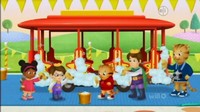 Boarding Trolley to find out how many passengers can ride, Daniel and Miss Elaina learn how Trolley is cleaned after it rolls through a muddy puddle. Arriving at the Trolley Wash, Daniel and Miss Elaina help Prince Tuesday and Prince Wednesday scrub Trolley. Daniel make-believes that he is using a silly machine to wash Trolley.