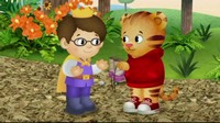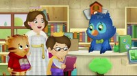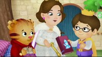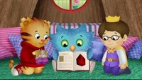 Daniel Tiger is at the library looking through is "purple scopes" -- some special glasses he made to make everything look purple. Queen Sara and Prince Wednesday arrive with a box of books to donate to the library. She explains that "you can choose things like books or a toy and give them to someone else to enjoy." Prince Wednesday decides that he would like to keep one of the books from the box.