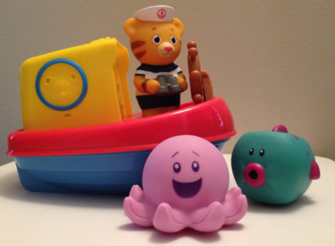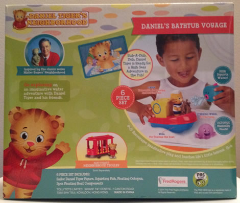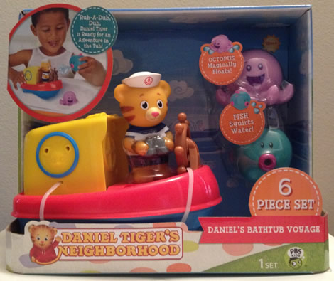 Daniel's Bathtub VoyageDate: 2014 © 2014 The Fred Rogers Company DescriptionRub-A-Dub, Dub, Daniel Tiger is ready for a high seas adventure in the tub! This six piece set includes a boat which separates into three pieces, a floating octopus, a squirting fish, and a Daniel Tiger figure dressed in his sailor outfit.