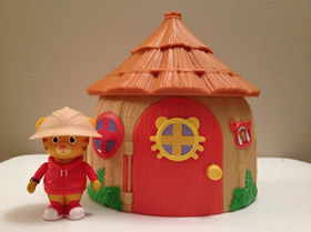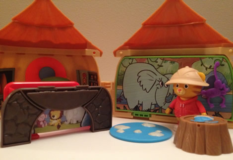 Daniel Tiger's Bungalow Adventure PlaysetDate: 2013 © 2013 The Fred Rogers Company DescriptionThe bungalow measures approximately 5.75" tall and comes with a standard Daniel Tiger figure wearing a removable safari hat as well as several other fun accessories.