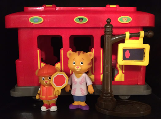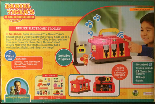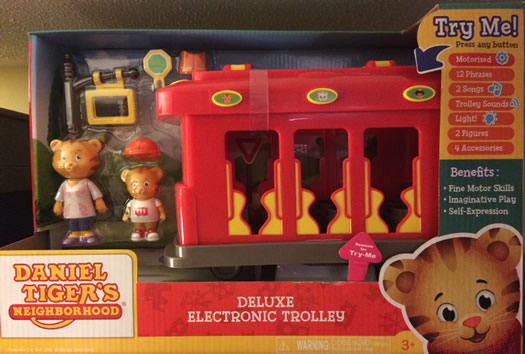 Deluxe Electronic TrolleyDate: 2015 © 2015 The Fred Rogers Company DescriptionCome ride along! The Daniel Tiger's Neighborhood Deluxe Electronic Trolley holds up to 6 figures. Push the buttons on Trolley to hear phrases from your favorite characters! This motorized Trolley rolls with the touch of a button, has a working headlight, and plays two songs! Includes Trolley, Mom Tiger Daniel Tiger figures, crossing guard accessories, and a stop/go sign on pole. All pieces fit inside and can be carried using the handle on the top of Trolley. NotesSongs include: It's a Beautiful Day in the Neighborhood and Stop and Listen to Stay Safe. View instruction manual for this toy HERE. |