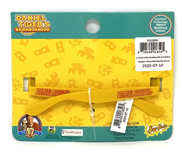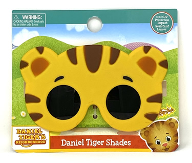 Daniel Tiger ShadesDate: 2018 DescriptionDaniel Tiger is the best friend around and now you can bring him with you wherever you go with our Daniel Tiger Lil' Characters Sun-Staches! Grab your friends from the neighborhood and get ready to learn something fantastic in these stylish shades. Featuring red frames that match Daniel's red sweater, these stylish shades were made for fun in the sun and are the perfect gift for your little tiger. These aren't just sunglasses, they're Sun-Staches! [Amazon.com] NotesSun-Staches also marketed a similar pair of Daniel Tiger sunglasses labeled as "Daniel the Tiger Shades." |