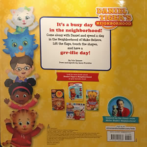 Poses and layouts by Jason Fruchter SummaryIt's a busy day in the neighborhood! Come along with Daniel and spend a day in the Neighbohrood of Make-Believe. Lift the flaps, touch the shapes, and have a grr-ific day! A busy book with flaps to lift, textures to touch, and tons of grr-ific fun! Appearing In This Book |
