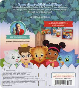 © 2014 The Fred Rogers Company SummaryCome along with Daniel Tiger, Katerina Kittycat, Miss Elaina, O the Owl, and Prince Wednesday as they pick out their costumes and go on a Halloween parade through the neighborhood! Happy Halloween, Daniel Tiger! is a "lift-the-flap" board book which allows readers to discover a picture and additional text on each page. In this particluar book, readers discover what Daniel and his friends are wearing for Halloween as they lift each flap.