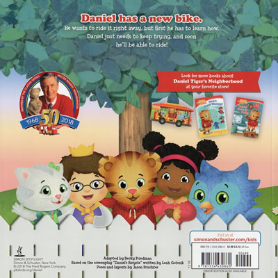 Adapted by Becky Friedman SummaryDaniel has a new bike. He wants to ride it right away, but first he has to learn how. Daniel just needs to keep trying, and soon he'll be able to ride! NotesThis book is based on the storyline from Episode 313a. At the end of this book are seven pages of tips and advice on bicycle safety. An adapted version of this book is featured in the treasury More Daniel Tiger 5-Minute Stories. Appearing In This Book |