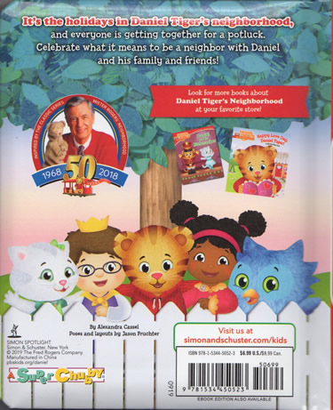 Poses and layouts by Jason Fruchter SummaryIt's the holidays in Daniel Tiger's neighborhood, and everyone is getting together for a potluck. Celebrate what it means to be a neighbor with Daniel and his family and friends! Appearing In This Book |