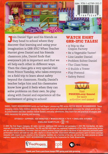 Running Time: Approx. 100 minutes DescriptionJoin Daniel Tiger and his friends as they head to school where they discover that learning and using your imagination is GRR-IFIC! When Teacher Harriet gives Daniel and his friends classroom jobs, Daniel finds that everyone's job is important and that we all help each other in different ways. Then the class gets a very special visit from Prince Tuesday, who takes everyone on a field trip to learn about safety beyond the classroom. Finally, Daniel's teacher helps him and his classmates know how good it feels when they can solve problems on their own. So play along with Daniel and experience all the excitement of going to school! Episodes on this DVD include: