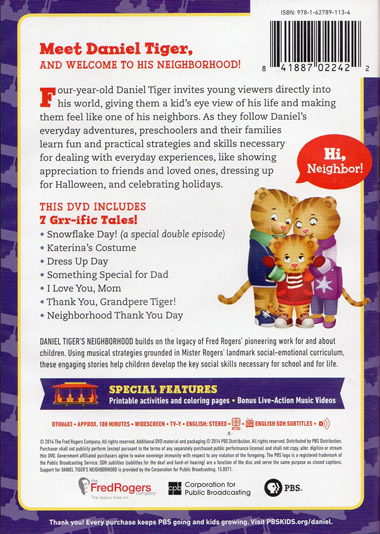 Running Time: Approx. 100 minutes Date: 2014 Running Time: Approx. 100 minutes DescriptionFour-year-old Daniel Tiger invites young viewers directly into his world, giving them a kid's eye view of his life and making them feel like one of his neighbors. As they follow Daniel's everyday adventures, preschoolers and their families learn fun and practical strategies and skills necessary for dealing with everyday experiences, like showing appreciation to friends and loved ones, dressing up for Halloween, and celebrating holidays. Episodes on this DVD include: