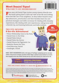 Running Time: Approx. 100 minutes Daniel Tiger invites young viewers directly into his world, giving them a kid's eye view of his life and making them feel like one of his neighbors. As they follow Daniel's everyday adventures, preschoolers and their families learn fun and practical strategies and skills necessary for dealing with everyday experiences, like dealing with new experiences, taking turns with a favorite toy, and learning bathroom and daily routines. DescriptionEpisodes on this DVD include: