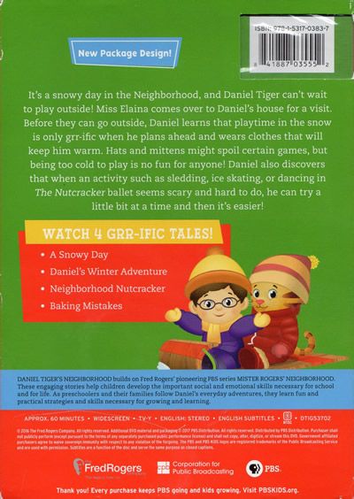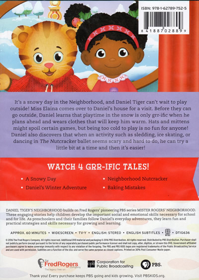 Running Time: Approx. 60 minutes DescriptionIt's a snowy day in the Neighborhood, and Daniel Tiger can't wait to play outside! Miss Elaina comes over to Daniel's house for a visit. Before they can go outside, Daniel learns that playtime in the snow is only grr-ific when he plans ahead and wears clothes that will keep him warm. Hats and mittens might spoil certain games, but being too cold to play is no fun for anyone! Daniel also discovers that when an activity such as sledding, ice skating, or dancing in The Nutcracker ballet seems scary and hard to do, he can try a little bit at a time and then it's easier! Episodes on this DVD include: Credits"A Snowy Day" - Written by Angela C. Santomero