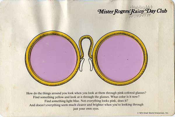 DescriptionHow do the things around you look when you look at them through pink-colored glasses? Find something yellow and look at it through the glasses. What color is it now? Find something light blue. Not everything looks pink, does it? And doesn't everything seem much clearer and brighter when you're looking through just your own eyes. © 1973 Small World Enterprises, Inc. |