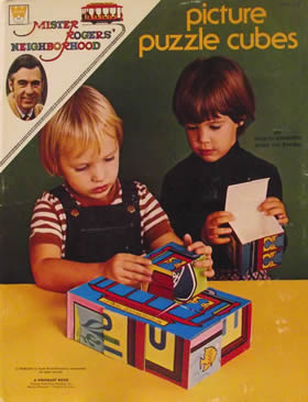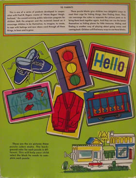 DescriptionThis is one of a series of products developed in cooperation with Fred M. Rogers, creator of "Mister Rogers' Neighborhood," the award-winning public television program for children. Both the program and the materials based on it encourage children to be themselves, to imagine, to create, to cope with feelings and new ideas -- and through all these things, to learn and to grow. These puzzle blocks give children two delightful ways to meet their urge for hiding things, then finding them. They can rearrange the cubes to separate the picture parts or to bring them back together again. And they can use the boxes themselves as hiding places for little treasures. Hiding and finding is another way of playing about going away and coming back. Children will find many ways to use these blocks. The concept here is pretty simple. Punch out the somewhat sturdy cardboard pieces and fold them to form six cubes. The cubes can be arranged to form any one of six images -- Mister Rogers' sneakers, his sweater, the fish tank, Picture Picture, the Trolley, or the stop light. Below are examples of two unpunched pages.