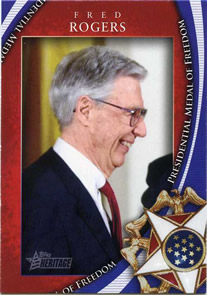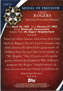 Card #MOF-24 from the 2009 Topps American Heritage set. FRED ROGERS There are more famous Americans than Fred McFeely Rogers, but it's hard to imagine one more universally beloved by generations of children than the man they knew simply as "Mr. Rogers." For 31 years, as the gentle genius behind the landmark PBS children's program Mr. Rogers' Neighborhood, he was an ever-welcome fixture in millions of American homes. |