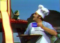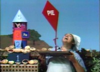 Chef Brockett stops by with three pies -- each a different shape. As he and Mister Rogers talk about Jack Horner, Mister Rogers sticks his thumb in the triangular pie and pulls out a plumb. Chef Brockett then demonstrates how turnovers are made. In the Neighborhood of Make-Believe, Chef Brockett is at the Eiffel Tower where Grandpere's machine provides him with a card that reads "Mangez Tarte" -- French for "Eat Pie." In return, Chef Brockett gives Grandpere a pie. As he leaves the tower, Chef Brockett is approached by Bob Dog who is carrying a cage that he goes into when he is bad. Even though Bob Dog puts on the cage to keep from eating one of Chef Brockett's pies, Chef Brockett gives him a chicken pie to eat. The magic kite flies over the Platypus mound and reads "Eat Pie." When Chef Brockett approaches the kite, he agrees to help Lady Elaine and X the Owl with the new pie resaurant as they sing the new pie song. As Make-Believe concludes, Bob Dog can be seen curiously sniffing the pies at the restaurant. Back at the house, Mister Rogers sings the Eat Pie song and talks about manners. Cleaning up his materials from the carpenter's bench, he concludes by feeding the fish and singing I'm Taking Care of You. Appearing In This EpisodeSongsImages