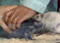Dr. Wang arrives with his rats which he places in the empty aquarium. He explains that the rats are used by doctors and scientists to help them learn how to better understand and help people. One rat is grey and the other is white, but Mister Rogers and Dr. Wang talk about how they are the same on the inside. Before Make-Believe, Mister Rogers wonders about how our bodies work and suggests that the rat's cage reminds him of the cage work by Bob Dog. He also shows how he operates the Trolley to make it come and go. In the Neighborhood of Make-Believe, Daniel Striped Tiger is talking to Bob Dog about how he, too, was once wild and used to scare people. When he is startled by Lady Aberlin, Bob Dog puts himself back in his cage where he feels safe. Although he made a lot of toast for the opening of the restaurant, Bob Dog is nervous about attending the grand opening but is encouraged to do so by Lady Aberlin. At the restaurant, King Friday is intimidated by Bob Dog and orders him to go someplace else. Back with Mister Rogers, Bob Trow stops by with models of Someplace Else. He and Mister Rogers set up the models which include the windmill, the community center, and a sign. Returning to Make-Believe, Donkey Hodie is lonely as he looks out his window for a friend at Someplace Else. Lady Aberlin and Dr. Bill arrive with Bob Dog who is gladly welcomed by Donkey Hodie. When he is encouraged to take off his cage, Bob Dog accepts Donkey Hodie's invitation to stay at the Someplace Else community center where he will learn to be tame. Back at the house, Mister Rogers talks about how people sometimes need to be alone and other times it is good for them to be with others. He concludes for the week by singing Just For Once. NotesA strange and oddly-aggressive interaction takes place in Make-Believe. When approached by Lady Aberlin, Bob Dog is startled and raises his fists snapping, "I'll hit you. I'll hit you." Lady Aberlin responds, "Did you think I was going to hit you?" before Bob Dog puts himself back in his cage.