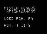 Episode CreditsProduced by WQED Pittsburgh, Pennsylvania in association with Small World Enterprises Inc. for N.E.T. Created and written by Fred Rogers Production funds for this television visit were provided by a grant from the Sears Roebuck Foundation and the Corporation for Public Broadcasting © 1970 National Educational Television and Radio Center |