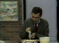 At the bakery, Mister Rogers talks with Mrs. Shenck about the special of the day -- challah. Moving into the back room, Chef Brockett introduces Mister Rogers to Roy Smith, a cake decorator who is putting the finishing touches on a wedding cake. Chef Brockett takes out a fresh cake and Mr. Smith demonstrates some basic decorating techniques and tops the cake with an Eiffel Tower. In the Neighborhood of Make-Believe, Chef Brockett makes a cake for Collette and leaves it sitting on the edge of the Eiffel Tower. Still feeling jealous of Collette, Henrietta is at the castle wishing that the cake would fall. Just then, a strong gust of wind knocks the cake to the ground leaving Henrietta feeling terrible. Thanks to Lady Elaine and her boomerang, the cake is restored to its orginal form. Back at the house, Mister Rogers attempts to decorate a cake while he talks about how wishes. He concludes by singing Wishes Don't Make Things Come True. NotesThis week's Neighborhood of Make-Believe story is used as the basis for two children's books: Henrietta Meets Someone New and Wishes Don't Make Things Come True. Inside the bakery, Mister Rogers visits briefly with another customer -- Hedda Sharapan -- who is shopping with her nine-month-old daughter Amy.