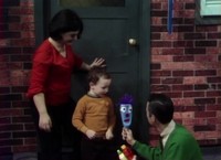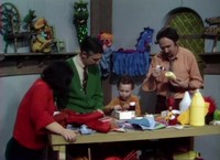As Mister Rogers goes to visit the Browns, Judy Brown and her son Mike are just leaving to pick up some material from Betty's Little Theater. Inside, Bob Brown shows several puppets he has made from empty plastic bottles before his wife and son return with material they use to complete a puppet creation in progress. At Brockett's Bakery, Chef Brockett is on his way to the gym for some exercise and Mister Rogers purchases some donuts after talking with Mrs. Schenk about some Spanish words. Back at the house, Mister Rogers uses an envelope to make a very simple puppet. NotesThis is one of the few episodes of Mister Rogers' Neighborhood which does not feature a Neighborhood of Make-Believe segment. The detergent bottle puppet made in this episode is seen again in Episode 1205. Appearing In This EpisodeSongsImages