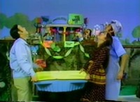 Chef Brockett stops by with a cupcake on a purple dish as well as the film about the whirlpool. He and Mister Rogers watch the short film as Chef Brockett describes the scenes. In the Neighborhood of Make-Believe, Handyman Negri and Plumber Horne are moving the castle waterfall to the Museum Go-Round to help welcome Lady Elaine home from space. Everyone is still buzzing with excitement at the thought of Lady Elaine's big discovery which is believed to be a husband. Via radio, Lady Elaine informs Handyman Negri that she will be splashing down soon. Lady Aberlin continues to be the voice of reason as she tries to remind everyone that Lady Elaine has never mentioned anything remotely related to the idea of getting married. Unfortunately, no one is listening to her as Chef Brockett arrives with a wedding cake. Lady Elaine makes her triumphant return as she splashes down at the Museum Go-Round. She is welcomed home as everyone excitedly sings I'm Proud of You; however, Lady Elaine is somewhat confused when she is asked about her husband. Announcing that she is not getting married, Lady Elaine let's everyone know that she will reveal her wonderful discovery "on Tuesday." Back at the house, Mister Rogers briefly talks again about spreading rumors before Elsie Neal stops by with some disappointing news. Apparently the clay pot she and Mister Rogers had made together was misplaced when it was being taken to the kiln. Before leaving, she shows a "multi-media painting" to Mister Rogers and explains that many different materials were used in the painting. Mister Rogers concludes for the day after returning to the back yard to pick up the whirlpool. Appearing In This Episode