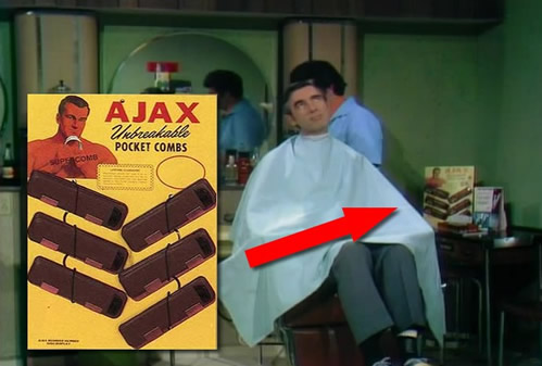 In the back corner of Mr. Failla's barbershop is a display for Ajax Unbreakable Pocket Combs.