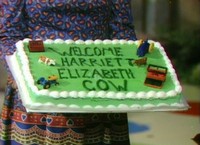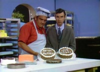 Visiting Brockett's Bakery, Mister Rogers meets the bakery's new employee -- Jose -- who is the cousin of Mrs. Shenk. Mrs. Shenk is on leave from the bakery as she is having a baby. In the kitchen, Chef Brockett is making personalized cakes -- round cakes with people's names written in frosting. While the frosting on Mister Rogers' cake sets, he and Chef Brockett go to the bakery's soda shop where they make a purple cow from grape juice, ice cream, and soda. Returning to the house, Mister Rogers calls Mrs. Shenk to wish her the best. She says she will come back to the bakery part-time after the baby is born. In the Neighborhood of Make-Believe, Edgar Cooke agrees to make a cake with Harriett Elizabeth Cow's name on it. When it is finished, everyone gathers at Someplace Else to welcome Harriett to the Neighborhood. As the cake is presented to Ms. Cow, milk pours from the sky and ruins the cake. While some wonder if Daniel's friend Malcolm Apricot Dinko is responsible, it is clearly the work of Lady Elaine Fairchilde dressed as a purple cow. Back at the house, Mister Rogers gathers his cake and chalk board as he concludes for the day. NotesThe Neighborhoood of Make-Believe plot in this episode is the same plot found in the book No One Can Ever Take Your Place. There are no credits shown on this episode (see below). After talking with Edgar Cooke, Handyman Negri bumps his back on the Trolley track as he ducks underneath.
