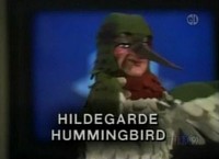 This episode is not closed with a song, as most episodes are. Unlike the other modern episodes, the credits at the end of this episode scroll on the screen rather than appearing in the usual screen-by-screen fashion. Based on the announcement at the beginning of the opera, this opera is produced by "The Royal O Room Opera Company." Hildegarde is a ruby-throated hummingbird. Bubblewitness News broadcasts are brought through the courtesy of the National Bubble Chemical Company. Images of an original prop from this episode were shared by a Neighborhood Archive reader.
