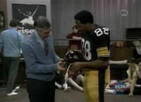 Visiting the Neighborhood dance studio, Mister Rogers meets ballet master Bob Davis who is teaching a class. Mr. Swann is running behind schedule so Mister Rogers watches the ballet class as he waits. Soon, Mr. Swann arrives wearing his full football uniform. Before talking about his interest in dance and giving a demonstration of his ballet skills, Mr. Swann shows Mister Rogers the various parts of his uniform and protective gear. In the Neighborhood of Make-Believe, everyone is finishing their drawings for the contest. Meanwhile, Lynn Swann and Bob Dog are sad after losing a football game. Lady Aberlin helps them to feel better by dancing their way to the castle. At the castle, King Friday gives a new hint about the surprise prize leading participants to believe that the prize may have something to do with the weather. The Trolley delivers a message from the school where the children have prepared their drawings. While Ana's is very detailed and well done, it is clear that Daniel and Prince Tuesday's artistic abilities are not as strong. Back at castle, Corney submits his drawing of the Neighborhood which is made of pretzels. Back at the house, Mister Rogers asks viewers how they might draw their own neighborhoods and suggests that "most of us draw what's important to us." Mister Rogers concludes by singing It's You I Like. NotesFollowing a Hall of Fame career in football, Lynn Swann has gone on to spend time as a broadcaster and also a successful political career. For more on the life and careers of Lynn Swann, read the entry about him on Wikipedia. The dance studio featured in this episode is the Pittsburgh Ballet Theater School. As this episode draws to a close, Mister Rogers talks about things that are important to people. His comments at this point in the episode summarize what he found to be so imporant: "I was just thinking, what's most important to me are inside things. It's not the games that you play or the prizes you win that are really important to the poeple who love you most. It's you. You and your own feelings." This episode is included on the DVD collection Mister Rogers Meets New Friends. Appearing In This Episode