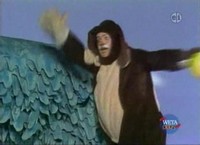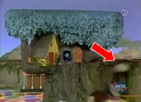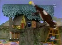 Mr. McFeely stops by on his new delivery tricycle as he is on his way to deliver a walker to someone who was recently in an accident. After he and Mister Rogers demonstrate the walker, Mister Rogers goes back inside where he pretends that Hischer has fallen from the banister. This leads to a discussion about getting hurt and how it feels nice to have someone you love nearby when accidents happen. Mister Rogers then sings Please Don't Think It's Funny. In the Neighborhood of Make-Believe, Handyman Negri is on his ladder cleaning the top of the castle when Bob Dog receives a call that there is a ball stuck in X the Owl's tree. Borrowing Handyman Negri's ladder, Bob Dog goes to the tree to help but upon finding the ball atop the tree, he slips from the ladder and falls to the ground. After Dr. Bill is brought in for help, it is decided that Bob Dog should be taken to the hospital. On the way, King Friday finds out about the accident and bans all play in the Neighborhood of Make-Believe. Back at the house, Mister Rogers shows a takes a ride around the room on a wooden toy tractor before viewing a film about how the tractors are made. Afterwards, he talks about the importance of playing safe and then sings By Pretending. NotesCall me naive, but I'm fairly certain that that's a real person falling to the ground in the Neighborhood of Make-Believe and not a dummy substituted for this scene. If it is a real person, honestly, the fall looks somewhat painful. While I'm not sure if this is a real person or not, I am 100% certain that the foot flies off the Bob Dog costume as a result of the impact (see the arrow in the image below on the right).