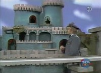 A dark purple cover underneath the Trolley track is used to hide the puppeteers (likely Fred Rogers) as King Friday and Queen Sara stand outside the castle.