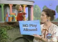 Using the Neighborhood of Make-Believe models in the kitchen, Mister Rogers reviews the previous day's events. In the Neighborhood of Make-Believe, Lady Aberlin is directed to hang "No Play Allowed" signs to remind everyone of King Friday's newest order. While everyone is unhappy about the new rule, no one is more disgruntled than Lady Elaine Fairchilde. After expressing her displeasure to King Friday himself, Lady Elaine moves her Museum Go-Round to an entirely new location. With a few mistaken stops along the way, Lady Elaine finds herself in a place where play is welcome -- a play park where she meets Barbara Russell. Back at the house, Mister Rogers takes the Museum Go-Round model off of the table and then the other buildings as well. Then he does his best to recall where each one was previously located on the empty table. Mister Rogers talks about how Lade Elaine's neighbors must have felt when she left without saying goodbye. With this idea in mind, he sings I Like to Be Told. Mister Roger concludes the day with a film about people moving a real house and by spending a moment playing with the block building and the toy tractor from the previous day. NotesThe wooden blocks used in this episode appear to be the same ones -- in design, at least -- used in Episode 0022 and Episode 1397. Appearing In This Episode