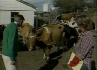 After a phone call from Jane Henshaw, Mister Rogers visits her at the Neighborhood dairy farm where he learns about cows. He also sees how cows are milked and how the milk is bottled. In the Neighborhood of Make-Believe, the heat wave continues as Ana Platypus waits on her father to come home so her family can take a trip to the beach. At the Museum-Go-Round, Lady Aberlin questions Lady Elaine Fairchilde about the rumor of a swimming pool and learns that the plans are already underway. Near the castle, Ellen Peterson from Paterson's Pools is surveying the Neighborhood property. After a somewhat subtle conversation with X the Owl about volunteer work, Ms. Paterson and Lady Aberlin are called to the castle where they show King Friday a sketch of the proposed pool. They are joined by Beaver O'Day who also works for Paterson's Pools. Together, Beaver O'Day and Ms. Paterson continue surveying the nearby land. It appears that the swimming pool will cost exactly 4,500 -- more than the funds available. To help save money, it is decided that everyone in the Neighborhood will be asked to help dig the hole for the pool. Meanwhile, at the Platypus mound, Ana is disappointed that her father is still working and their beach picnic will be delayed. Lady Aberlin helps Ana talk about her feelings and explains that her father works hard because he cares for his family. Back at the house, Mister Rogers uses empty milk cartons to make building blocks and talks about how children cannot always have the toys they want and sometimes might want to make their own toys. NotesAlways a child at heart, Mister Rogers is not only fascinated by seeing his breath in the milk cooler, he also says a quiet hello the the cows as he enters the farm yard.