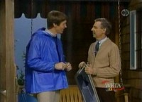 After he steps out onto the porch to watch the rain, Mister Rogers sings a "raining" version of Let's Think of Something To Do: "Let's think of something to do while it's raining...while it's raining." Chuck Aber stops by and tells Mister Rogers of an upcoming visit from dancer Sam Weber. Mister Rogers tells Mr. Aber about how the raindrops seem to dance off his palm and then the two practice making animal sounds. In the Neighborhood of Make-Believe, it is only half-raining as Lady Aberlin dances about in her raincoat. Stopping at the tree, she learns that X the Owl is hoping to see a rainbow. At the clock, Daniel is learning tai chi from Patrick Cheng who is visiting the Neighborhood. Mr. Cheng further demonstrates a variety of tai chi techniques. Daniel shares that he was hoping tai chi could help him "knock out [his] bad dreams." Meanwhile, at the factory, Corney has invented a new Dance Rockit which Neighbor Aber demonstrates. Back at the house, Mister Rogers sings You've Got to Do It before reading Rainy Rainy Saturday by Jack Prelutsky. NotesDuring the opening sequence, clouds can be seen over the Neighborhood model and the sound of rain can be heard in the background. This supports the idea of a rainy day in the Neighborhood. A rainbow can be seen under the clouds during the closing sequence. Rainy Rainy Saturday is available for purchase through Amazon.com. This episode is included on the DVD Kindness Collection. Appearing In This Episode