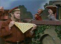 Outside, Chef Brockett has a different kind of crutches -- ones with cuffs on them. While he was in the hospital, Chef Brockett painted a picture of a cupcake which he gives to Mister Rogers. In the Neighborhood of Make-Believe, King Friday continues to insist that everyone wear a "three-cornered one" and provided a hat for Betty Okonak Templeton who finds a loophole in King Friday's command. At the Museum-Go-Round, she and Robert Troll see a gift that was sent to Lady Elaine by Chef Brockett -- a scarf with three corners. Considering King Friday's command is to wear a "three-cornered one," Robert Troll puts the scarf around Lady Elaine's shoulders which technically keeps her in line with the King's command. Back at the house, Mister Rogers returns to the church from the previous day where he meets with Alan Morrison and two other musicians, Demarre and Anthony McGill. The McGill brothers demonstrate their instruments -- a flute and a clarinet -- before Mr. Morrison returns to the piano wearing a tuxedo. Together they practice for their upcoming performance. Returning to the house, Mister Rogers sings I'm Proud of You before Mr. McFeely stops by with an unglued paper bag and a video about how people make paper bags. Appearing In This Episode