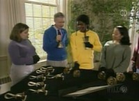 Back at the house, Mr. McFeely stops by with another bell and a videotape about how people make bells. Ringing their bells together, Mister Rogers and Mr. McFeely sing the Speedy Delivery song.