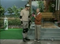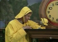 Back inside, Mister Rogers takes out another doll -- a baby wearing a diaper. Taking the doll into the bathroom, he talks about learning to use the potty before he sings Go Stop Go. In the Neighborhood of Make-Believe, Neighbor Aber is wearing a raincoat as Lady Elaine continues squirting water from her hose. At the factory, he helps Corney install an umbrella over the factory. After Neighbor Aber sings I'm a Man Who Manufactures, Corney shares his newest product -- an umbrella Rockit. Moving on to the Museum-Go-Round, Neighbor Aber suggests that Lady Elaine think of other people before she squirts them with water. She finds that others are okay with the small squirts of water if they know about them ahead of time. After Neighbor Aber and Daniel both take a healthy dose of water from Lady Elaine, they sing It's You I Like. Back at the house, Mr. McFeely stops by with a videotape about how people make concrete sidewalks. After the video, Mister Rogers plays a quick game of hide-and-seek with viewers. NotesIn Episode 1649, Corney makes a pretend umbrella Rockit for Daniel's imaginary friend, Malcolm Apricot Dinko. Appearing In This Episode