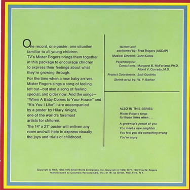 The full box set it also available in LP format on the 1973 Mister Rogers Sings For Those Times When... Appearing On This RecordCreditsWritten and performed by: Fred Rogers (ASCAP) Copyright © 1967, 1968, 1973 Small World Enterprises, Inc. |