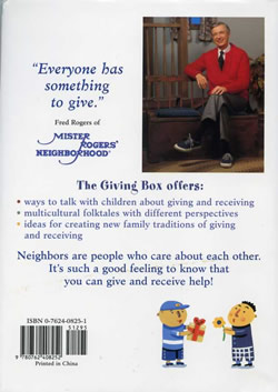 Text © 2000 by Family Communications, Inc. SummaryThe Giving Box is a collection of "anecdotes, multicultural folktales, and suggested activities" designed to help families "discover the spirit, meaning, and joy of giving and receiving." NotesThis book is packaged in a plastic box and comes with a small metal bank.