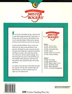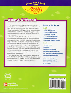 Editorial Consultants: Cathy Cohen Droz, Elaine Lynch, Aisha White Copyright © 1999 by Family Communications, Inc. DescriptionFor over 30 years, Mister Rogers has been a television friend to young children, helping them grow both "inside and out" as they learn along withi him every day. Alike & Different brings to you his deep understanding of children and how they grow, and features practical, hands-on activities for your classroom. Just look inside Alike & Different -- there is so much to do! Children learn that things are alike and different as they experiment with high and low sounds, sing quickly and slowly, and compare foods. Children learn to appreciate the similarities and differences in people as they compare shoes and feet, create self-portraits, and discuss physical challenges. And, to make learning about the concepts of alike and different even more meaningful, children play games in which they match, make predictions about, and play with objects that are alike and different. As a teacher, you have many ways to help children learn about their world. Now, with these ideas from Mister Rogers and Alike & Different, you will have a wonderful resource to support you in this important work. A Letter From Fred RogersDear Neighbor, In many ways we are all alike -- and yet we're all different! We can feel a great sense of kinship to those around us and at the same time recognize that each one of us is unique! During much of our lives, we often play the tug-of-war game of being accepted as part of a group while still remaining our individual selves! That game begins early on when young children say no as a way of separating themselves so they can feel some sense of autonomy -- a sense of being different from the people whom they love. Sometimes saying no to someone else's suggestion is a way of saying yes to self-control. Of course, what matters most for children is how they feel about their uniqueness once they do begin to realize that they are, in some ways, different from everyone else. How they feel about this early in their lives often determines whether they grow into adults who rejoice in the diversity of the world's people or into adults who fear and resent that kind of diversity. We want to do all we can to encourage children to become adults who rejoice in living in a world of endless variety of human beings and at the same time share with their neighbors the hopes, fears, joys, and sorrows we all have in common. Of course, we do this best by being that way ourselves. Attitudes are caught, not taught! Fred Rogers |