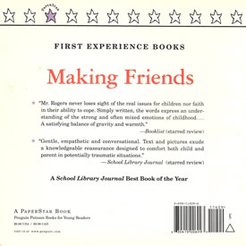 Text and photographs copyright © 1987 by Family Communications, Inc. SummaryMaking Friends is a publication from the Mister Rogers' Neighborhood First Experiences series (originally published in 1987). In this book, real life photos are used to help young people feel more comfortable with interacting with other children and making new friends. A Note From Fred RogersOne of life's greatest joys is the comfortable give-and-take of a good friendship. It is a wonderful feeling not only to have a good friend but to know how to be a good friend yourself. Learning about friendship begins at an early age when children "graduate" from playing side by side to playing with each other. There is so much to learn about sharing toys and sharing loved ones as children begin to share themselves with others. It can be disheartening for a parent to watch a toddler fighting over a toy or jostling for a first place in line. Nonetheless, learning to share and learning to compromise are enormous challenges for the young child whose view of the world is still largely self-centered. Our adult patience and realistic expectations can be as helpful to the child as knowing when we ought to step in and mediate a dispute. A good friend of mine once remarked that "character is caught, not taught." I think that is also true of empathy and tolerance and the other things that have to do with being a good friend...they're all caught, not taught. We can provide our children with opportunities for play with their peers. We can offer them suggestions for compromise, and we can intervene when necessary. But our greatest gift may be the examples we set in our own friendships. It is from us, I believe, that our children are likely to learn best. |