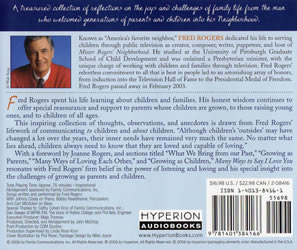 Abridged on 1 CD DescriptionFred Rogers spent his life leanring about children and families. His honest wisdom continues to offer special reassurance and support to parents whose children are grown, to those raising young ones, and to children of all ages. This inspiring collection of thoughts, observations, and anecdotes is drawn from Fred Rogers' lifework of communicating to children and about children. "Although children's 'outsides' may have changed a lot over the years, their inner needs have remained very much the same. No matter what lies ahead, children always need to know that they are loved and capable of loving." With a Foreword by Joanne Rogers, and sections titled What We Bring From Our Past, Growing as Parents, Many Ways of Loving Each Other, and Growing as Children, Many Ways to Say I Love You resonates with Fred Rogers' firm belief in the power of listening and loving and his special insight into the challenges of growing as parents and children. |