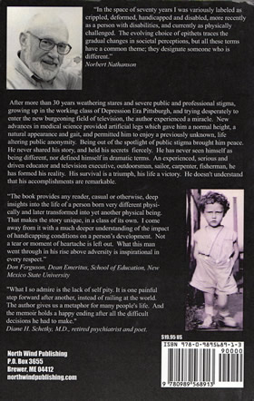 Copyright © 2013 by Norbert Nathanson DescriptionAfter more than 30 years of weathering stares and severe public and professional stigma, growing up in the working class of Depression Era Pittsburgh, and trying desperately to enter the new burgeoning field of television, Norbert Nathanson experienced a miracle. Born without feet and with only one hand, new advances in medical science provided artificial legs which gave him a normal height, a natural appearance and gait, and permitted him to enjoy a previously unknown, life-altering public anonymity. Being out of the spotlight of public stigma brought him peace. He never shared his story, and he held his secrets fiercely. He has never seen himself as being different, nor defined himself in dramatic terms. Driven to exceed his circumstances, Nathanson is an educator and exceutive and has talents in many fields. He has formed his own reality, and not only is his survival is a triumph but his life is a victory. NotesMr. Nathanson served as the volunteer art director during the earliest days of WQED and provided many illustrations for the station as well as The Children's Corner. |