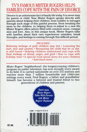 Copyright © 1987 by Fred Rogers and Clare O'Brien DescriptionDivorce is an unfortunate fact of family life today. It is never easy for parent or child. Now, Mister Rogers speaks directly with parents about helping their children, from toddler to teenager, through each stage of this painful process. From breaking the news to the children, to helping them re-adjust to anew life, Mister Rogers offers advice filled with common sense, compassion and love. Also in this unique book, Mister Rogers talks with families about their own experiences -- mistakes, breakthroughs, and feelings in coming through this difficult period. |