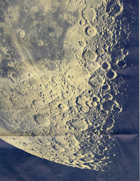 Don't you ever get scared? Everyone feels scared of some things sometimes, even grownups, presidents, mothers, and astronauts. The astronauts on the way to the moon are going very far away from earth. They are riding in a small, tight place inside the rocket. When they get to the moon, there is no one else there. It makes sense that the astronauts would feel scared sometimes! But even feeling scared isn't enough to stop people from doing something they really want to do. Why are spacesuits white? Are they very heavy? White helps keep you cool. The moon is a very hot place when the sun shines right on it. The spacesuit is also air-conditioned; cool, clean air flows inside it to keep the astronaut comfortable. A spacesuit weighs seventy pounds, about as much as two children. The zipper is in the back and hard to reach. Someone has to help the astronauts put it on, the way you sometimes need help with a heavy jacket. When the astronaut is all dressed in his space suit and helmet and boots and gloves, he looks like a robot or a superman. But we know he isn't. Inside the spacesuit is a real person, with thoughts and feelings like ours. What does the moon look like close up? On the moon there are no trees or flowers, no bugs, no mice, no birds, buses, jungles or cities. The moon made Al Worden think of a huge sandy desert. There are mountains and rocks, and many big holes called craters where smaller space rocks have crashed into the moon. How do astronauts go to the potty? On the way to the moon, astronauts go to the potty just the way we do on earth. The only difference is that when they make a BM, they bring it back to earth with them in a sealed plastic bag. That's easier than trying to throw something out of a rocket. Will you ride a car on the moon? The astronauts did drive a car on the moon. Because the moon is a bumpy place without roads and highways, Al Worden's space car looked like a Jeep. Where is your telephone? Al Worden's telephone was right inside his space suit. There are earphones and a mouthpiece right inside his helmet so that everything he said could be heard by men in the flight control room on earth, and they could talk back to him. Because the telephones let him talk to people on earth, Al Worden felt less lonely and afraid than he might have. Can children go to the moon? Not yet, says Al Worden. Before children could go to the moon, they would have to be trained about space flight, the moon, and how to live on it. Space suits would have to be made to fit them. Al Worden brings a rock to the Neighborhood all the way from the moon! Everyone has to take special care of it. Since scientists study moon rocks to find out what the moon is made of, they wan to be sure that no air or dust or dirt from the earth gets on them. So the rock is kept in a vacuum-sealed container that no one except the scientists must open. So there is no way to get your hands on that piece of moon rock. "Now I know again how children feel," Mister Rogers says, "when people say, 'Don't touch!'" Sometimes when you look out your window at night, the moon looks like this.