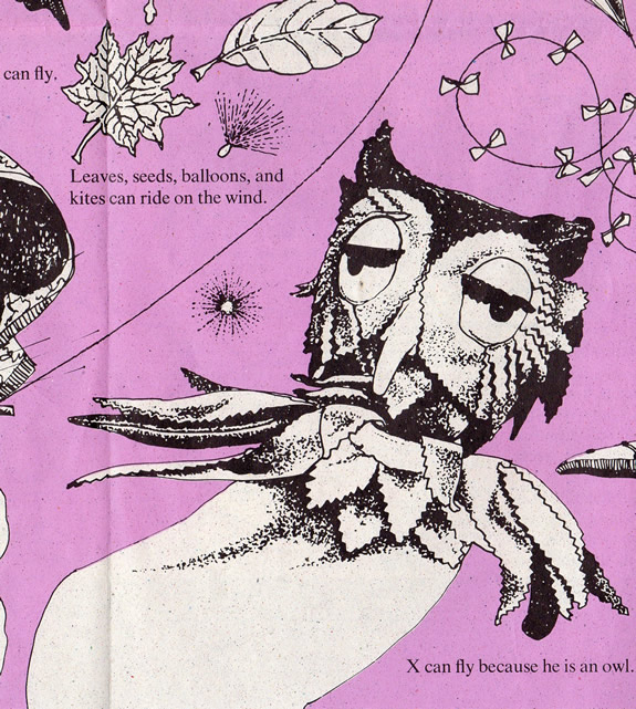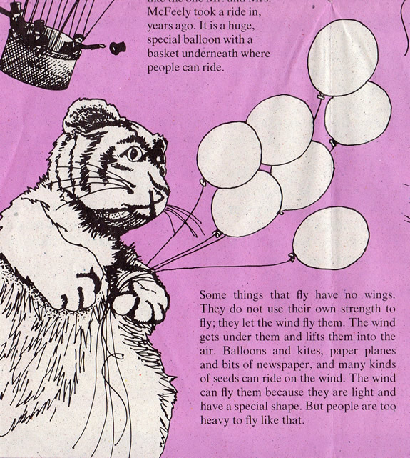 "No birthday?" Daniel felt sorry for Panda. That was awful. There must be some way Panda could have a birthday of his own. "Could I ask for a special birthday present?" Daniel asked. "I'd like to have an extra birthday to give to Panda." "That's a good idea," said Francois. "But I don't think it can be done. I think either you have a birthday or you don't." The Panda appeared. "I don't have a birthday. I'll never have a birthday." And he vanished again. "Then I'll give my birthday to Panda," Daniel said. He did not think of how it would feel for him to have no birthday. The next day Daniel had a cough that hurt his throat. "That's a bad cough you have there, Daniel," said Yoshi Ito. "I guess nobody will even notice my cough," Daniel said. He coughed. "I guess everybody's talking about Panda's birthday. Oh, I wish I hadn't given my birthday away. Now I'll never have another one." "Oh, Daniel," said Yoshi. "Your birthday is still your birthday. I have a cousin who was born on the same day as I was. We both have the same birthday." "But you can't do that," said Daniel. "You can't both have the same day." Handyman Negri said, "Sure you can. Lots of people are born on the same day. I have a good friend who has the same birthday I have." Daniel said, "Can a Purple Panda and a striped tier have the very same birthday?" "Yes," said Yoshi Ito. "And a panda and a tiger can both go for a birthday ride in the King's plane." "And share a birthday cake?" asked Daniel. "Sure," said Handyman Negri. "Your birthday will always be your birthday. It's a holiday just for you. You can share it if you want to. But it's always your own special day." So in the Neighborhood of Make-Believe, a tiger and a panda shared the very same birthday. Many different things can fly. Most birds can fly. Their bodies are light and feathery. Their wings are wide and strong. They can beat their wings back and forth very quickly. This lifts their bodies up into the air. Their tail-feathers help them go left and right, and up and down. People built gliders that could ride on the wind.