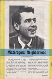 Misterogers' NeighborhoodPublication: Jack and Jill The door opens and in comes smiling Misterogers singing, "It's a lovely day in this neighborhood." He exchanges his topcoat and jacket for a comfortable house sweater and asks, "Won't you be my neighbor?"