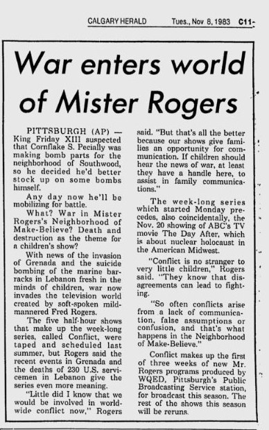 PITTSBURGH (AP) -- King Friday XIII suspected that Cornflake S. Pecailly was making bomb parts for the neighborhood of Southwood, so he decided he'd better stock up on some bombs himself. Any day now he'll be mobilizing for battle. What? War in Mister Rogers's Neighborhood of Make-Believe? Death and destruction as the theme for a children's show? With news of the invasion of Grenada and the suicide bombing of the marine barracks in Lebanon fresh in the minds of children, war now invades the television world created by soft-spoken mild-mannered Fred Rogers. The five half-hour shows that make up the week-long series, called Conflict, were taped and scheduled last summer, but Rogers said the recent events in Grenada and the deaths of 230 U.S. servicemen in Lebanon give the series even more meaning. "Little did I know that we would be involved in world-wide conflict now," Rogers said. "But that's all the better because our shows give families an opportunity for communication. If children should hear the news of war, at least they have a handle here, to assist in family communications." The week-long series which started Monday precedes, also coincidentally, the Nov. 20 showing of ABC's TV movie The Day After, which is about nuclear holocaust in the American Midwest. "Conflict is no stranger to very little children," Rogers said, "They know that disagreements can lead to fighting. "So often conflicts arise from lack of communication, false assumptions or confusion, and that's what happens in the Neighborhood of Make-Believe." Conflict makes up the first of three weeks of new Mr. Rogers programs produced by WQED, Pittsburgh's Public Broadcasting Service station, for broadcast this season. The rest of the shows this season will be reruns.