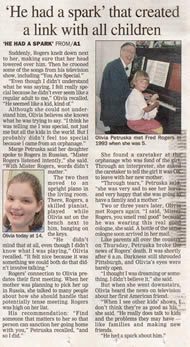 ‘HE HAD A SPARK’ THAT CREATED A LINK WITH ALL CHILDREN Fred Rogers’ gentle way with children knew no bounds – not even language or culture. Olivia Petruska, 14, of Aspinwall, was 5 and newly adopted from a Russian orphanage when she met Rogers, a friend of her mother. Olivia was attending a brunch with her mother, Marge Petruska, at the home of Bill and Marty Isler in Squirrel Hill. Olivia had just left St. Petersburg two or three weeks earlier. Not knowing a single word of English, she played with the Islers’ English spaniels. Olivia was a lonely 35-pound girl with glasses. Suddenly, Rogers knelt down next to her, making sure that her head towered over him. Then he crooned some of the songs from his television show, including “You Are Special... -- Read this complete article at triblive.com |