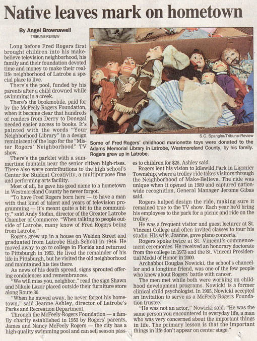 There’s the parklet with summertime fountain near the senior citizen high-rises. There also were contributions to the high school’s Center for Student Creativity, a multipurpose fine and performing arts facility. Most of all, he gave his good name to a hometown in Westmoreland County he never forgot. “To have Fred Rogers born here – to have a man with that kind of talent and years of television programming – it’s meant quite a bit to the community,” said Andy Stofan, director of the Greater Latrobe Chamber of Commerce. “When talking to people outside of Latrobe, many know of Fred Rogers being from Latrobe.” Rogers grew up in a house on Weldon Street and graduated from Latrobe High School in 1946. He moved away to go to college in Florida and returned to Pittsburgh in 1953. He lived the remainder of his life in Pittsburgh, but he visited the old neighborhood and maintained his ties there. As news of his death spread, signs sprouted offering condolences and remembrances. “We will miss you, neighbor,” read the sign Shawn and Nikole Lazor placed outside their furniture store along Route 30. “When he moved away, he never forgot his hometown,” said Jeanne Ashley, director of Latrobe’s Parks and Recreation Department. Through the McFeely-Rogers Foundation – a family charity established in 1953 by Rogers’ parents, James and Nancy McFeely Rogers – the city has a high-quality swimming pool and can sell season passes to children for $25, Ashley said. Rogers lent his vision to Idlewild Park in Ligonier Township, where a trolley ride takes visitors through the Neighborhood of Make-Believe. The ride was unique when it opened in 1989 and captured nationwide recognition, General Manager Jerome Gibas said. Rogers helped design the ride, making sure it remained true to the TV show. Each year he’d bring his employees to the park for a picnic and ride on the trolley. He was a frequent visitor and guest lecturer at St. Vincent College and often invited classes to tour his studio. His wife, Joanne, gave piano concerts. Rogers spoke twice at St. Vincent’s commencement ceremonies. He received an honorary doctorate from the college in 1973 and the St. Vincent Presidential Medal of Honor in 2000. Archabbot Douglas Nowicki, the school’s chancellor and longtime friend, was one of the few people who knew about Rogers’ battle with cancer. The men met while both were working on childhood development programs. Nowicki is a former clinical child psychologist. In 1985, Nowicki accepted an invitation to serve as a McFeely-Rogers Foundation trustee. “He was not an actor,” Nowicki said. “He was the same person you encountered in everyday life, an man who was very concerned about the important things in life. The primary lesson is that the important things in life don’t appear on center stage.” |