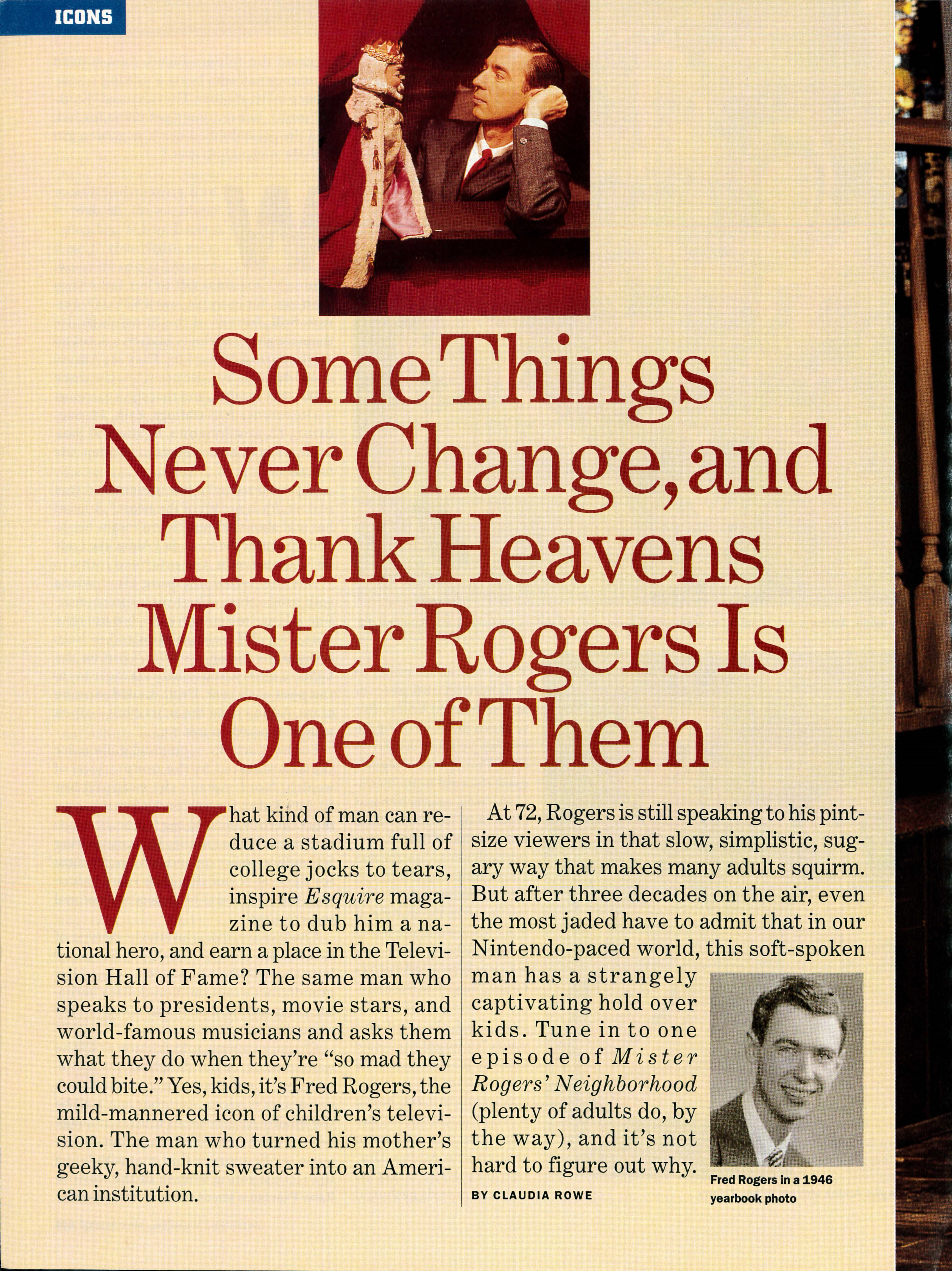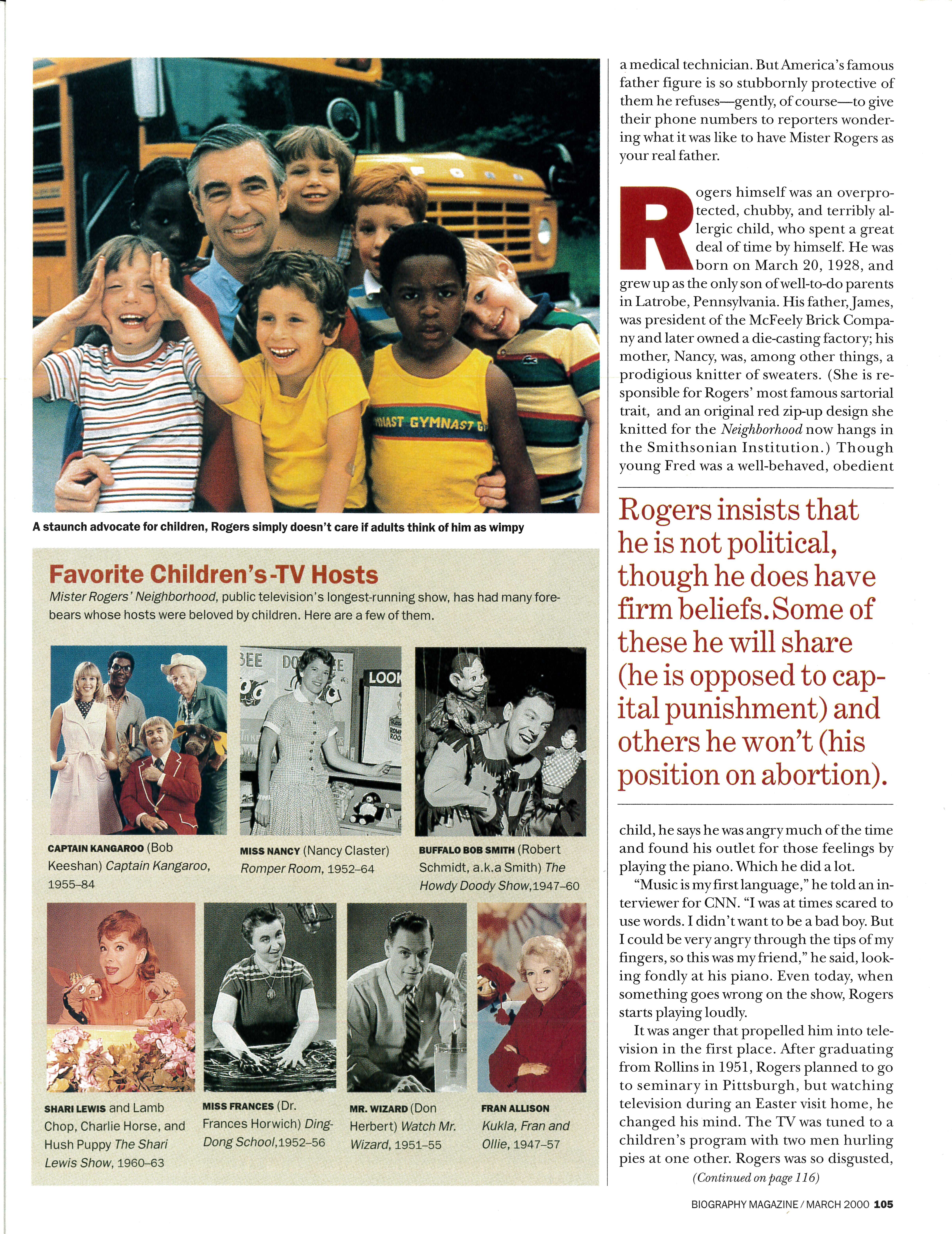 Biography MagazineThe March 2000 issue of Biography magazine featured an in-depth look at the life and career of Fred Rogers -- "Some Things Never Change, and Thank Heavens Mister Rogers Is One of Them." |